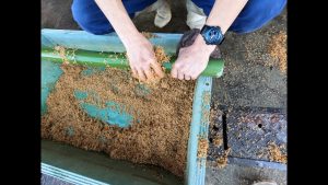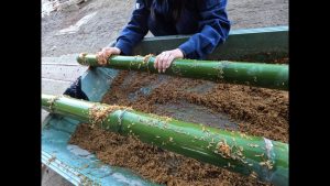 初回の実習では、切り出した竹を籾殻で丁寧に磨く作業を行いました。生徒たちは、竹の表面を傷つけないよう力加減に注意しながら、一本一本心を込めて仕上げていました。