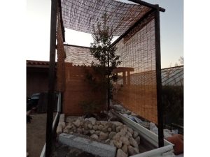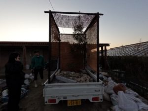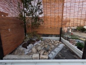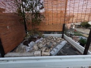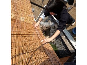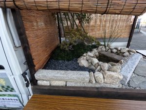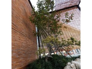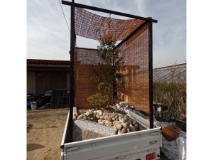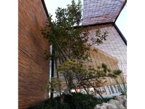 植栽は既存の農芸高校内の植物に加え近隣で植木卸売業を営む澤野園様へ生徒自ら材料調達へ伺い、シイモチの材料提供をいただき、庭の主木としました。