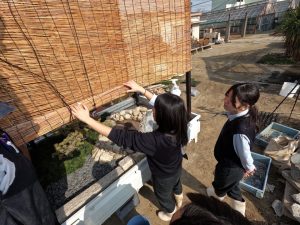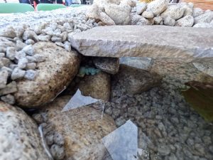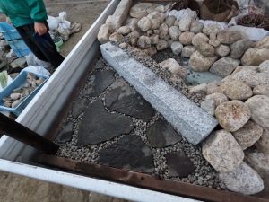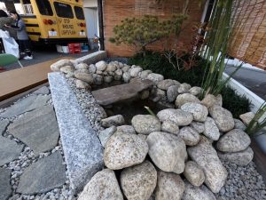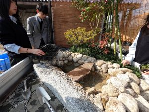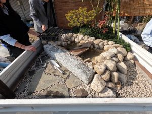 また、生徒たちが自ら考案した「遊び心」も見どころの一つでした。池の中の岩陰には、二匹の小さなカエルがひ っそりと隠されています。 「あ、こんなところにカエルがいる!」 そんな来場者の皆様の歓声を聞き、生徒たちは「細部まで見てもらえる喜び」を肌で感じることができました。これは教室の机の上だけでは決して得られない、生きた学びの瞬間です。
