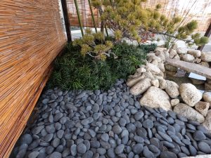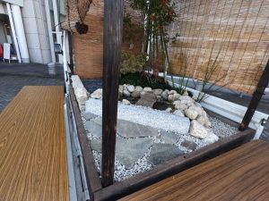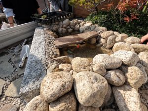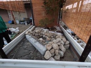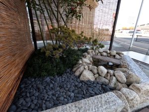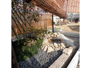 今回の作庭の中心に据えたのは、曲線美が特徴的な「瓢箪(ひょうたん)池」です。末広がりで縁起が良いとされるこの池には、厳しい寒さの中でも元気に泳ぐ4匹の金魚を放ちました。 石組み一つをとっても、ただ置くのではなく、石の「顔」を見て配置を決める。その一つひとつの妥協なき積み重ねが、会場を訪れた525名の方々の足を止める力になったのだと感じています。
