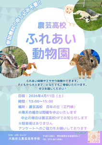 資源動物科活動日誌zoology 2026.03.25 4月11日(土)ふれあい動物園開催します! こんにちは!ふれあい動物専攻です! 4月11日に校内「百年の丘」で、動物園活動を行います!詳細は以下の画像をご覧下さい! ぜひお越しください!🐰🐐🐑🐎🦙 ※雨天の場合は開催を中止します。 (また中止の際は10時にHPへの掲載で連絡をさせていただきます。) ※駐車場はありませんので、公共交通機関でお越しください。 ※入場制限を行う場合があります。ご了承ください。